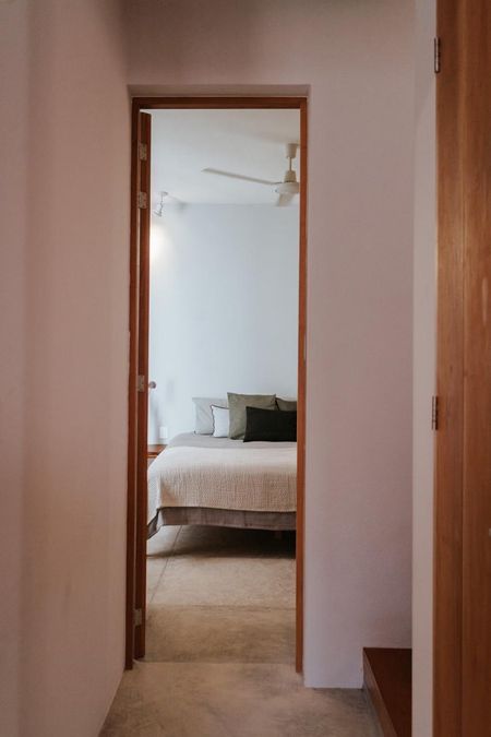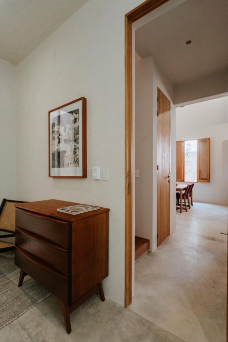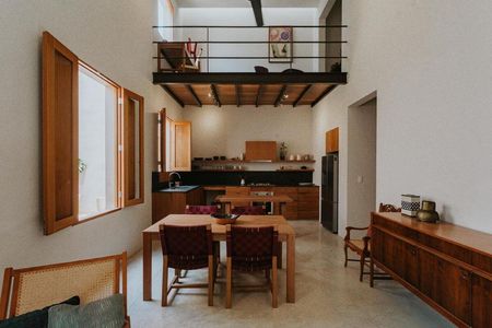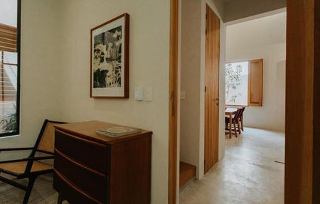 CASA 01 está distribuida en dos niveles, con patio interior para iluminar y ventilar. Las áreas comunes se diseñaron a doble altura con tapancos intermedios, lo que otorga una mayor calidad espacial. Las recámaras y baños se diseñaron pensando en la intimidad y el descanso (una recámara se encuentra en la planta baja, y la otra en el segundo nivel).