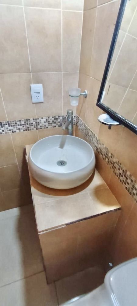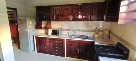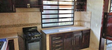 Cocina integral, con refrigerador, horno, estufa, tanque de gas, licuadora, cafetera.