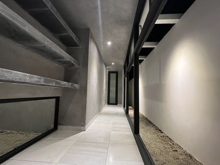 • Pasillo distribuidor con ventanal con vista a jardín iluminado con luces led.