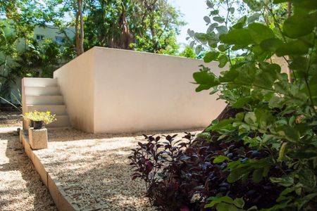 En la planta baja hay dos recámaras, la principal con baño completo, la secundaria comparte baño con visitas. Las sala y comedor combinados, la cocina separada de buen tamaño, cuarto de servicio u oficina con baño completo y entrada independiente, anteriormente la propietaria la utilizaba como consultorio. Amplio jardín con árboles frutales y alberca. Estacionamiento hasta para 6 autos y área de lavado.