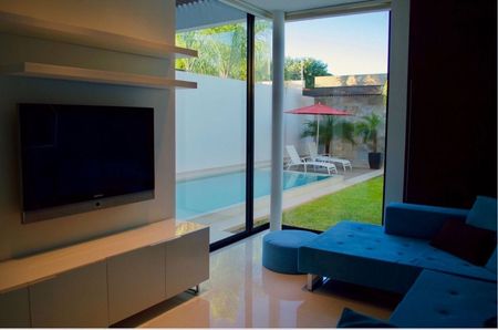 SALA, COMEDOR, COCINA INTEGRAL, 3 RECAMARAS CON BAÑO, la principal con cama king, una recámara con 2 individuales y otra recámara con una matrimonial y 2 individuales. (CON OPCION A 4, O UNA EN PLANTA BAJA), CUARTO DE T.V., CUARTO DE SERVICIO, TERRAZA TECHADA , alberca y JARDIN. Cuarto de servicio con baño y patio de lavado y tendido