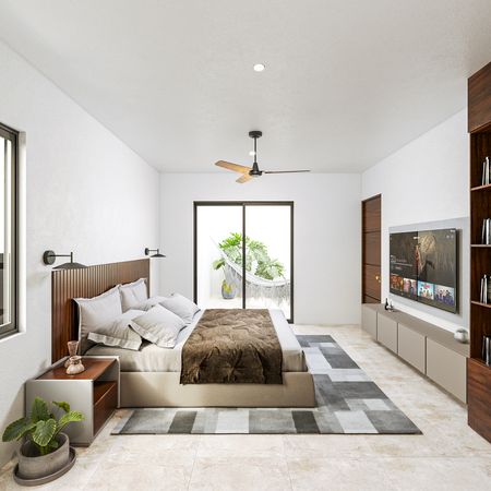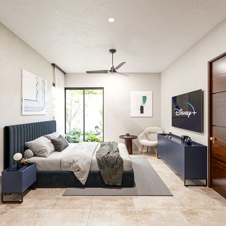 Recámara principal con closet vestidor y baño completo.