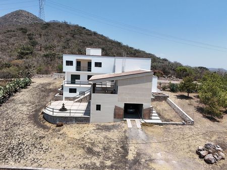 La casa tiene 550 m2 de construcción, 4 recámaras, 3½ baños, despacho, garaje techado para 1 auomóvil y un terreno de 9,000 m2 con árboles frutales, nopales y cactus de la región.