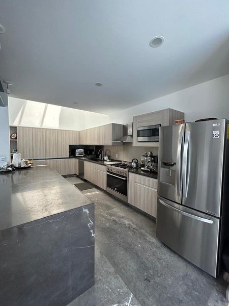 Cocina completamente equipada con horno, barra de mármol, lavavajillas, estufa de 6 quemadores Marca Teka, Amplios espacios de almacenamiento y concepto abierto.