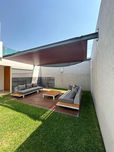 La casa cuenta con estacionamiento techado para dos autos, portón eléctrico y acceso directo al Garage de la casa. Además de acceso principal peatonal, cuarto de servicio y de lavado, cisterna, tanque de gas estacionario, dos tinacos de 1,100 litros.