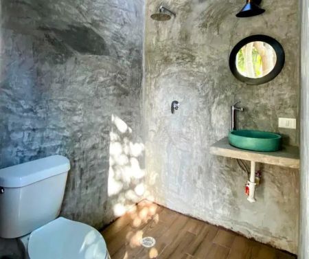 Recámara secundaria con baño completo, clóset, vista a la piscina, aire acondicionado y ventilador.