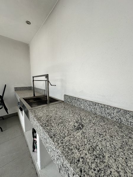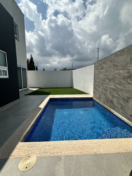El jardín cuenta con una alberca, acompañada de un cuarto de bombas, una terraza equipada con asador, barra de granito y un medio baño adicional.