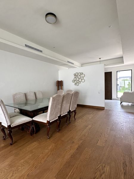 En la planta baja, encontrarás un acogedor recibidor que da paso a una espaciosa sala y comedor con vista al jardín. La cocina, equipada con electrodomésticos de solo dos años de uso, cuenta con un área amplia de antecomedor. También en esta planta se encuentra medio baño de visitas, y la lavandería que incluye lavadora y secadora, además de un cuarto de servicio.