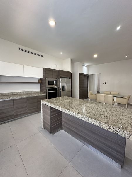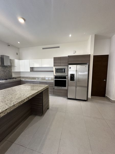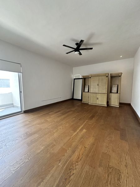 En el segundo nivel, una estancia con terraza se conecta a una amplia recámara principal, que dispone de un walk-in closet grande y un baño completo con tina. Además, hay dos amplias recámaras secundarias, cada una con su propio walk-in closet y baño completo.