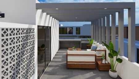 Roof garden con pérgolas y vista panorámica al campo de golf Cuarto de servicio con baño completo