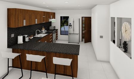 Cocina integral equipada con estufa y campana, cubierta de granito, isla. Medio baño para visitas