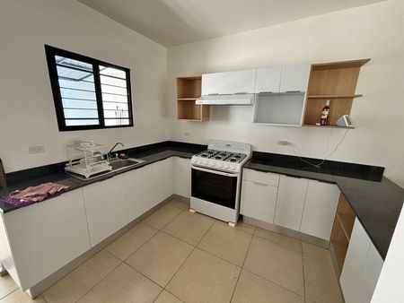* Cocina integral equipada con puerta mosquitero de herrería qué da al patio y tiene un tanque de gas.