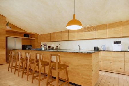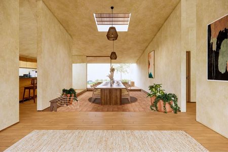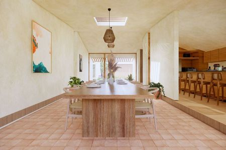 El gran vestíbulo con vistas sin obstrucciones al jardín posterior da paso al área central del espacio, un amplio comedor iluminado al que da servicio la cocina con isla y mucho espacio de almacenamiento, ambos con salida a la terraza.