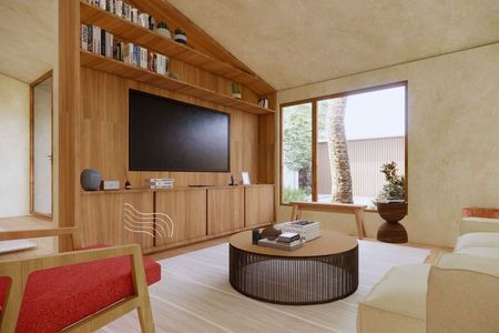 Con vistas a un patio privado está la sala, que por su distribución cerca al acceso puede usarse también como estudio.