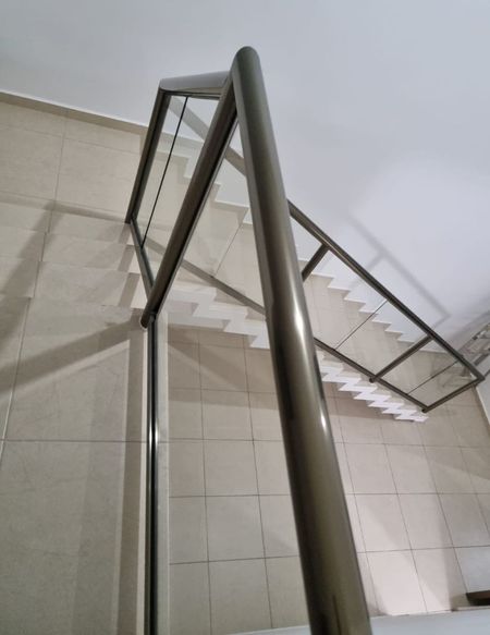 - Escalera con barandal de cristal con aluminio y huellas de luz