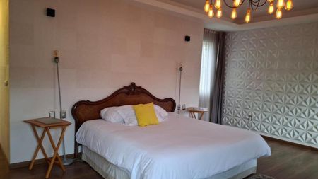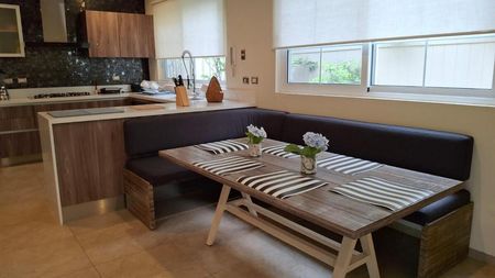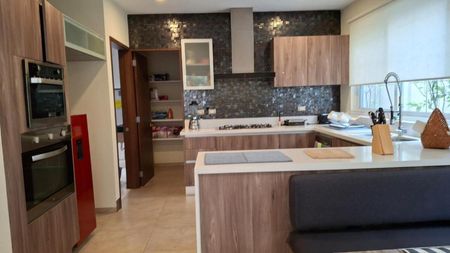 P.B. Cochera techada para 3 autos, Sala- Comedor muy amplios, Chimenea de Etanol, 1/2 Baño, Closet de blancos, Cortinas y Persianas de excelente calidad, Bar - Estudio, Cocina Equipada con estufa de acero, lava-vajillas, Despensa, Family room.