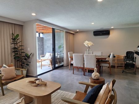 Primer nivel: sala, comedor, aire acondicionado, medio baño de visitas, jardín con terraza, cocina, cuarto de lavado y 2 cajones de estacionamiento.