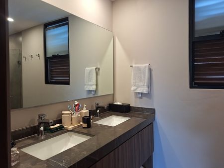 Segundo nivel: recámara principal con vestidor y baño aire acondicionado, sala de televisión abierta con mueble de escritorio, aire acondicionado, recámara secundaria con closet, baño y aire acondicionado.