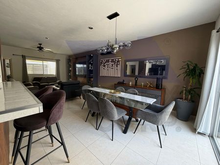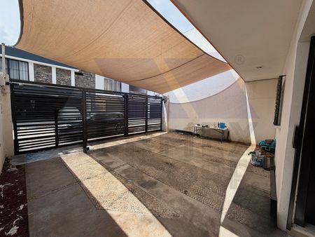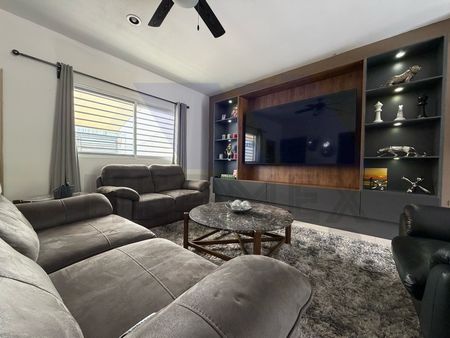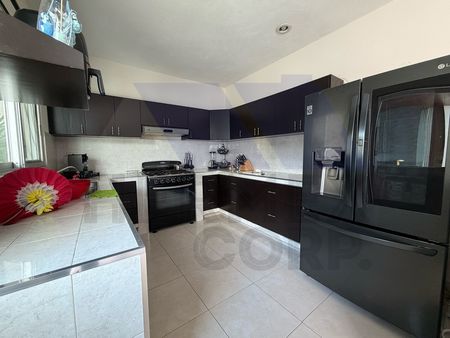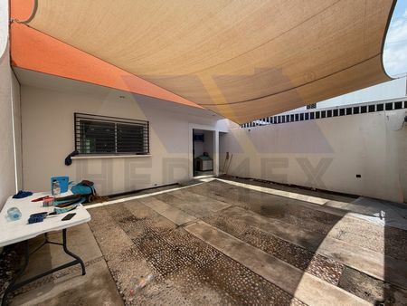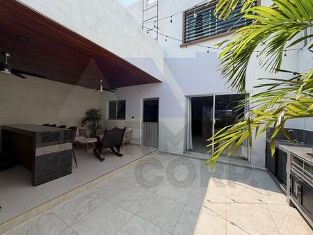 La casa en planta baja cuenta con área de sala, comedor, cocina, medio baño, terraza con área para asados y área techada con barra y garage para dos autos.