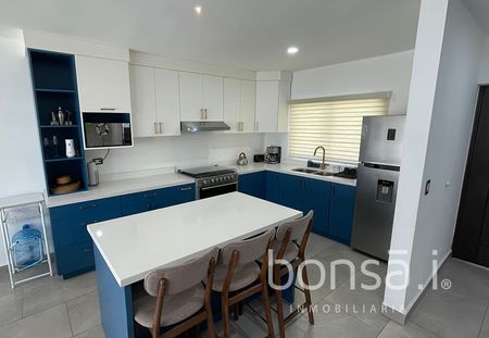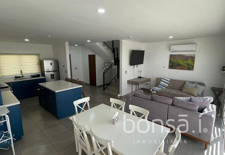 Beautiful house furnished and ready to move in, for rent, Private Subdivision with controlled access 24/7, consists of 3 bedrooms, 2 full bathrooms and 2 half bathrooms, living room with air conditioning, dining room, kitchen, terrace with a beautiful view of the mountains, laundry area, space for 2 cars. Nice common area with games and grills, 24/7 security, the rental price includes the cost of maintenance of the subdivision.