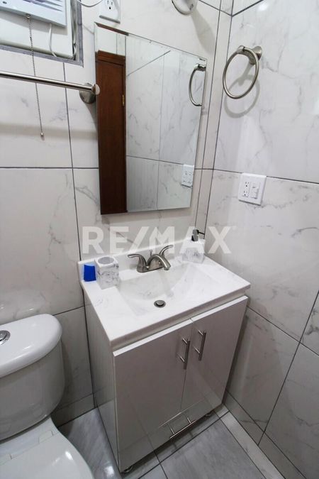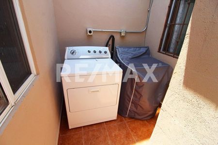Exterior cuenta con: Amplio almacén con medio baño y estantenteria y cajones para almacenar y colgar, área de lavado con lavadora y secadora, boiler eléctrico, loseta en patio trasero y pasillo, cochera eléctrica techada y con loseta para dos autos.