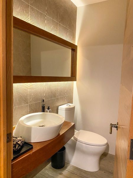 En la planta inferior está el área familiar, más privada, de tres recámaras y tres baños completos. La recámara principal accede a una terraza envolvente de espectaculares vistas. El baño principal tiene tina y contiguo un amplio vestidor tras unas puertas corredizas a dos hojas.
