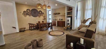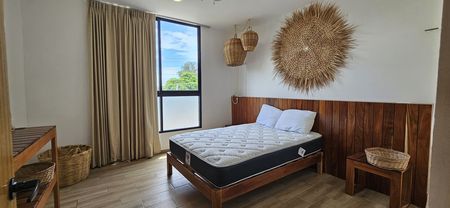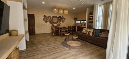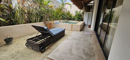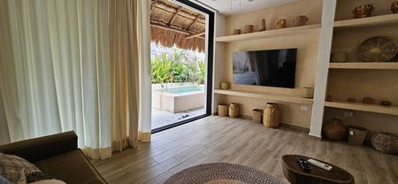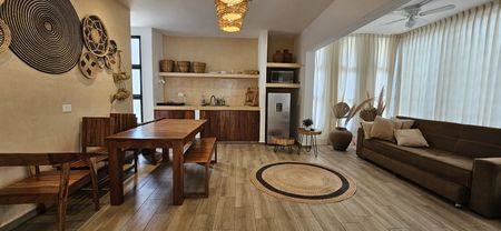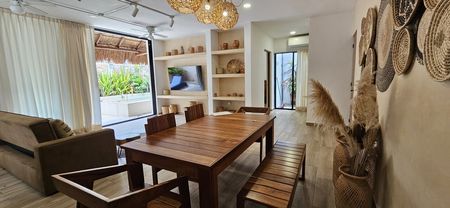 -Terraza techada con palapa de playa, comedor, hamacas y sillas de playa.