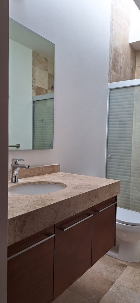 3 recámaras con persianas black out y aire acondicionado , principal con baño completo y vestidor, 2 recámaras secundarias que comparten baño completo.