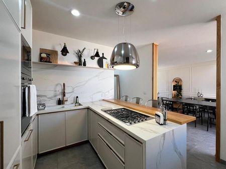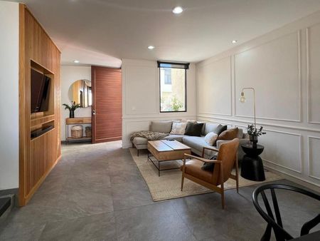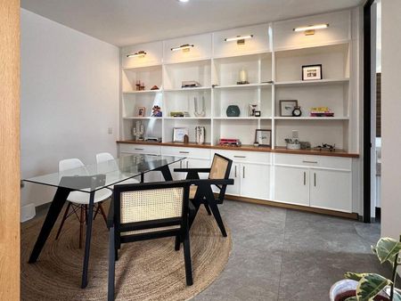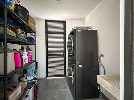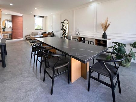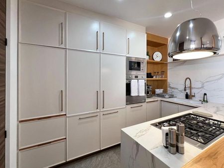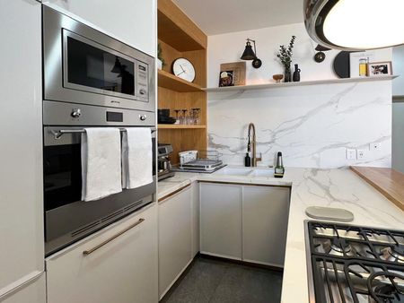 - Cocina equipada con horno eléctrico y de microondas, 2 refrigeradores y lavavajillas panelados todo en marca Smeg, con cubiertas de piedra sinterizada, tarja de cuarzo blanco y campana extractora flotante marca Elica