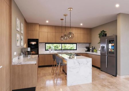 - Cocina con isla central y cubiertas en cuarzo calacatta, carpintería inferior y aérea, incluye lámparas decorativas