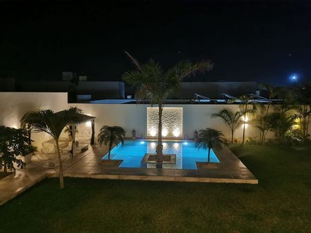 -Alberca con acabado chukum, diseño cuadrado con palmeras