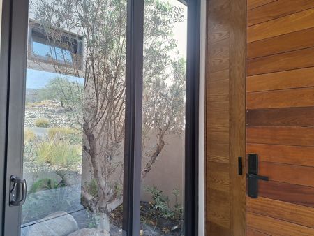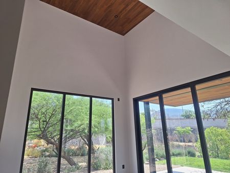 Pisos y recubrimientos de mármol veteado, canceles de cristal templado, herrajes de cromo, ventanas y ventanales de PVC, cristal templado, madera cumarú de exteriores en estacionamiento y terrazas. Piedra laja natural en fachadas principal y posterior