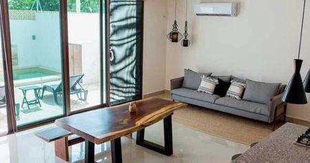 Cuenta con cortinas, mosquiteros y ventanales que son puertas hacia la alberca.