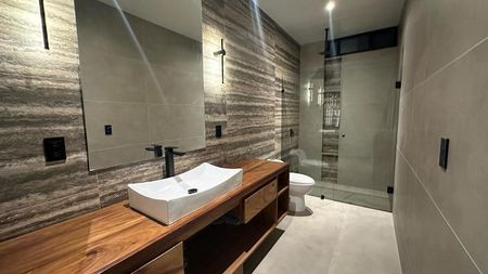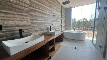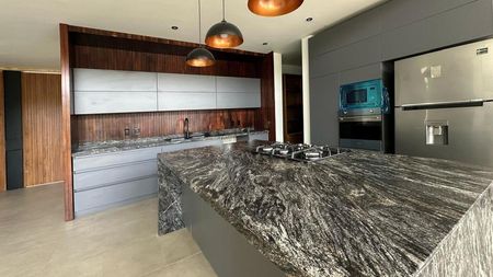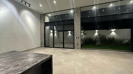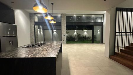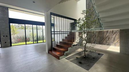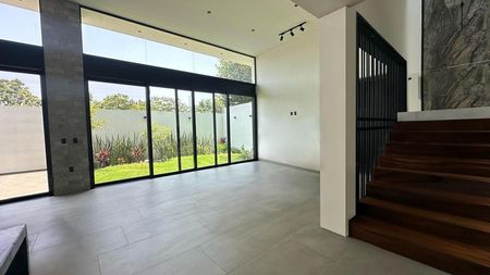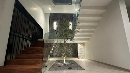 PLANTA BAJA: COCHERA PARA 6 VEHÍCULOS, RECIBIDOR CON ESTUDIO/ RECAMARA CON BAÑO COMPLETO, COCINA INTEGRAL CON ISLA Y BARRA DESAYUNADORA, SALA - COMEDOR BASTANTE AMPLIOS CON TECHO A DOBLE ALTURA, MEDIO BAÑO PARA VISITAS, JARDIN CON TERRAZA, ÁREA DE LAVADO CON CUARTO DE SERVICIO CON BAÑO COMPLETO Y BODEGA.