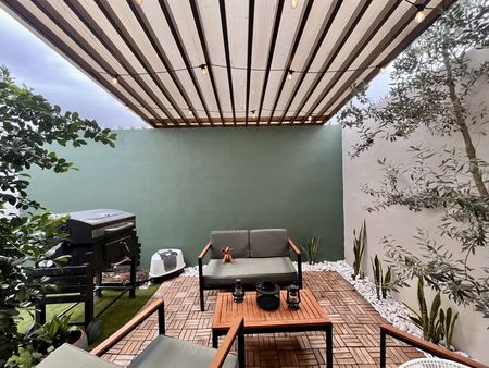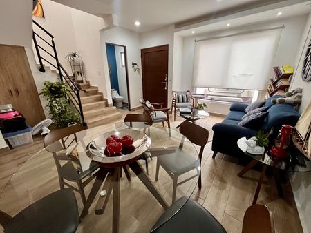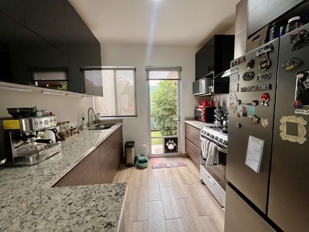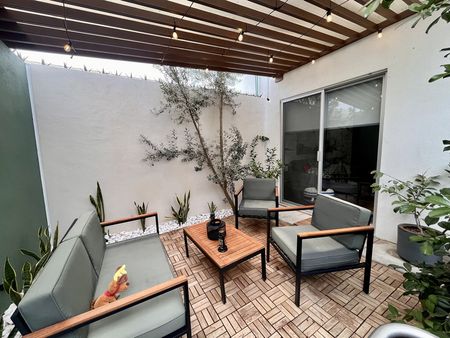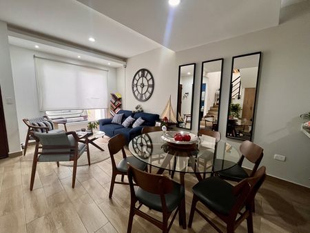 De dos niveles, en planta baja cuenta con cochera para 2 autos, espacio conjunto de sala y comedor, MÁS sala de TV independiente, cocina con barra desayunadora y amplio espacio de almacenaje y área de lavado. Además en planta baja cuenta con una hermosa y acogedora pérgola y jardín con pasto sintético.