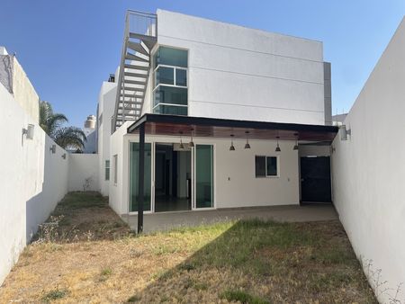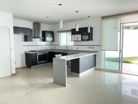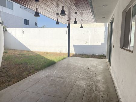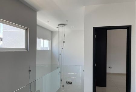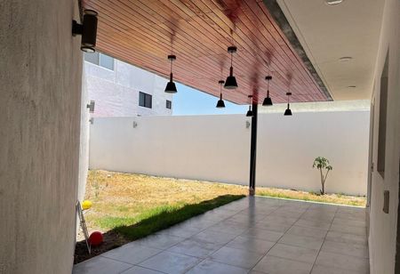 Sala con doble altura, baño de visitas espacio de bodega bajo la escalera con caja fuerte, amplio espacio de cocina con concepto abierto barra desayunador con barra de granito e iluminación led, alacena de piso a techo con espacio para cava, cuarto de lavado, terraza con pérgola e iluminación con lámparas colgantes, jardín de 80 m² Toda la planta baja cuenta con lámparas decorativas.