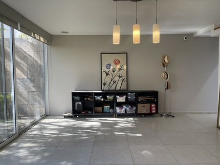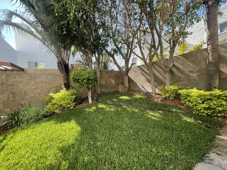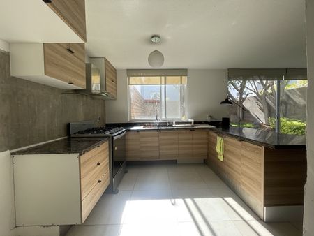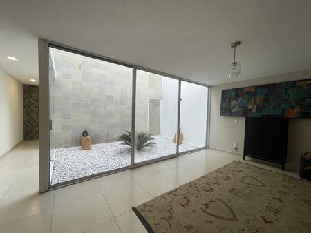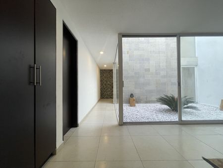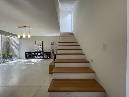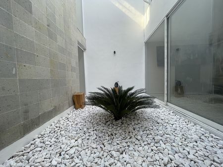 Planta baja: sala, comedor, medio baño de visitas, closet para colgar, cocina integral con alacena, bodega bajo las escaleras, jardín con bodega, área de lavado, jardín interior, estacionamiento para 2 autos.