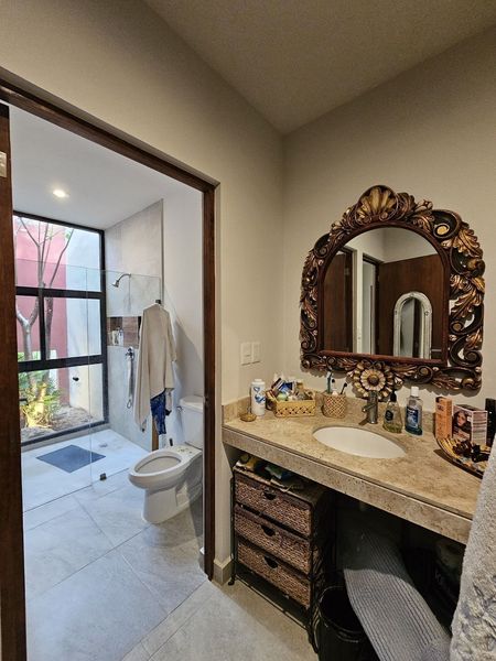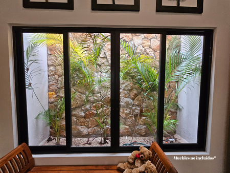 -Recamara principal con cuarto vestidor y baño completo, con jardín interior y ventanal a jardín exterior con espacio para desayunador o hamacas
