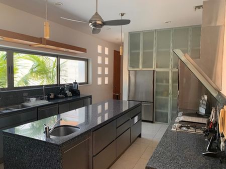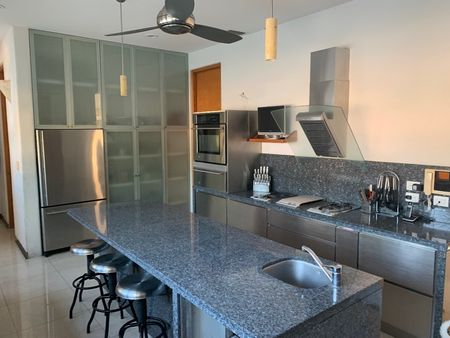Amplia cocina integral completamente equipada con meseta de granito de piedra gris