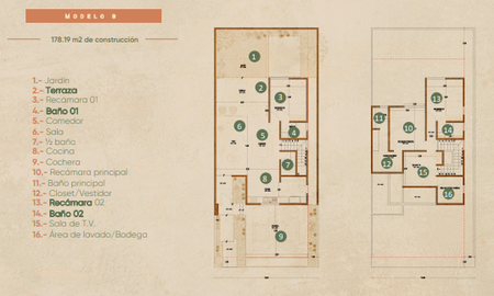 JardínTerrazaRecámara 01Baño 01ComedorSala½ bañoCocinaCocheraRecámara principalBaño principalCloset/VestidorRecámara 02Baño 02Sala de T.V.Área de lavado/Bodega
