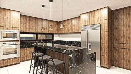 Cocina integral abierta con meseta de granito, gavetas con madera de parota, isla central, estufa, horno y microondas
