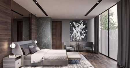 Acabados de lujo: pisos de mármol en placa, duela de ingeniería en recámaras. Carpintería de Nogal en closets y puertas.