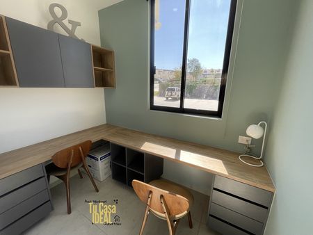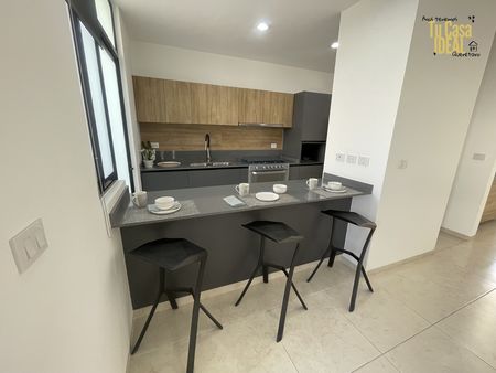 Cocina equipada con barra de cuarzo, closets, canceles, mueble de abajo del lavamanos y mosquiteros, bar y escritorio