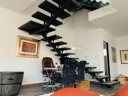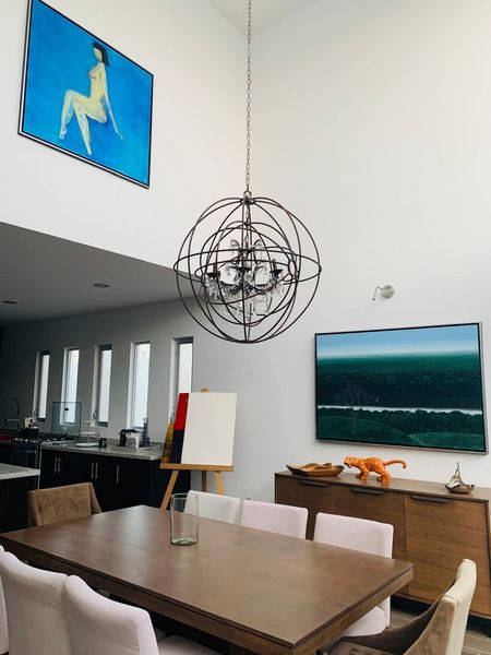 Planta baja: medio baño, sala, comedor con doble altura, cocina, todo abierto. Junto a cocina, cuarto de lavado y boiler.