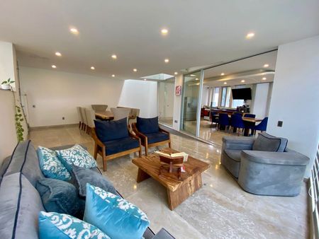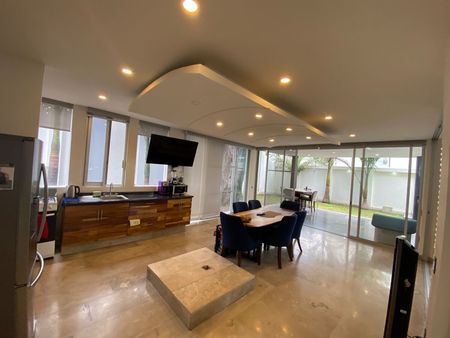 Dispone de 5 habitaciones, cada una con baño completo, incluyendo una recámara principal con vestidor y baño de gran tamaño. En total, la casa ofrece 6 baños, cocina integral con barra de granito, sala y comedor con vista al jardín, cuarto de TV o juegos, área de lavado, cuarto de servicio y un amplio roof garden ideal para reuniones o simplemente disfrutar la vista