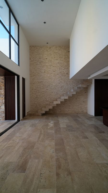Escalera forrada de mármol, pared de doble altura en piedra natural