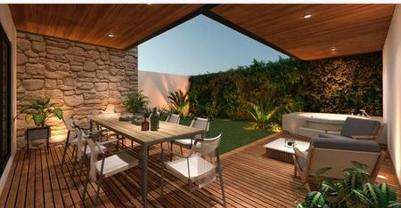 Planta baja: Sala y comedor a doble altura, cocina con cubierta de granito y amplia alacena, oficina, 4a recamara con baño, closet de visitas, terraza techada, jacuzzi, jardín, baño para visitas y estacionamiento techado para cuatro vehículos.