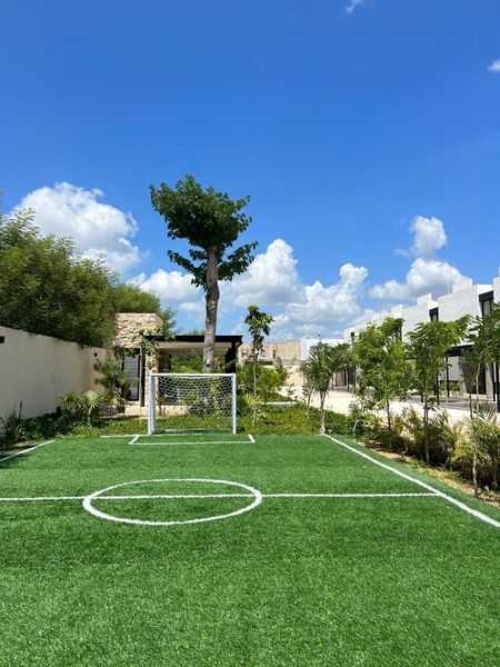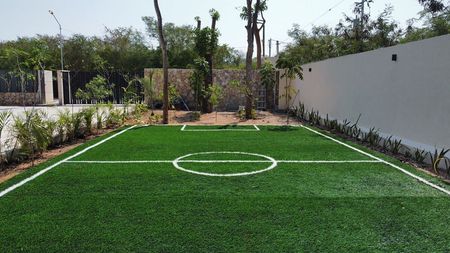 Cancha de futbol con porterías y pasto sintético e iluminación especial y bancas de contemplación y descanso.