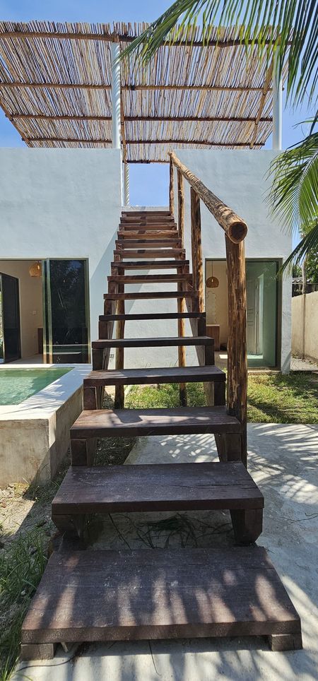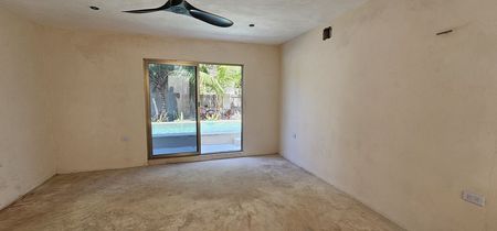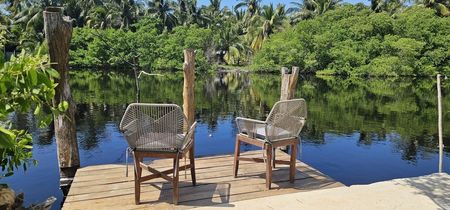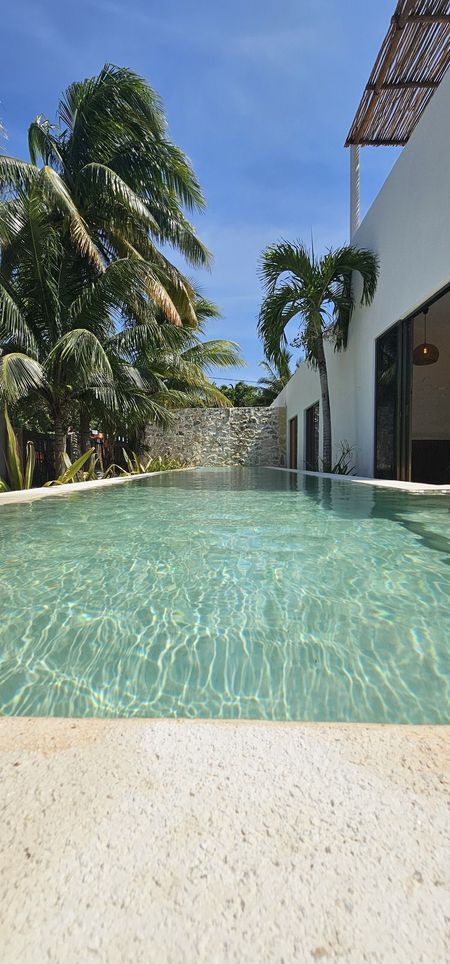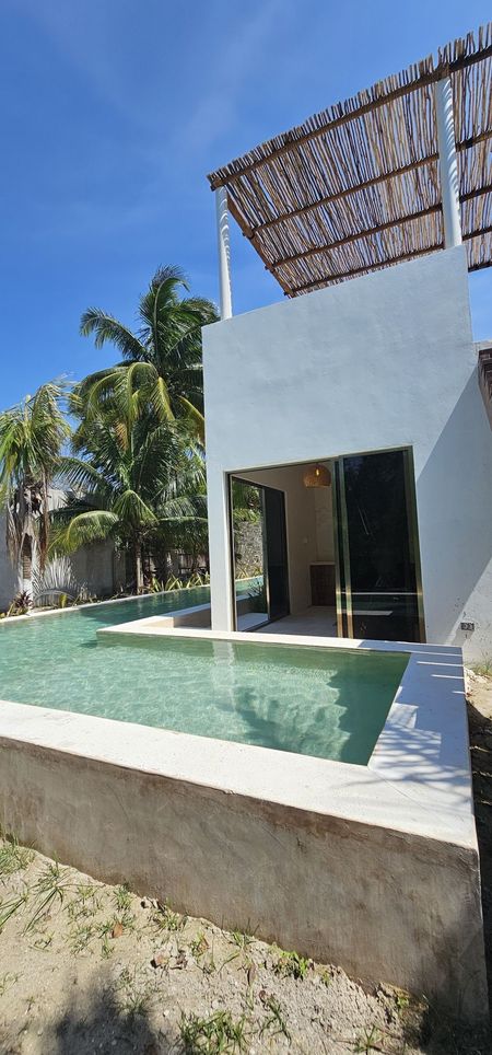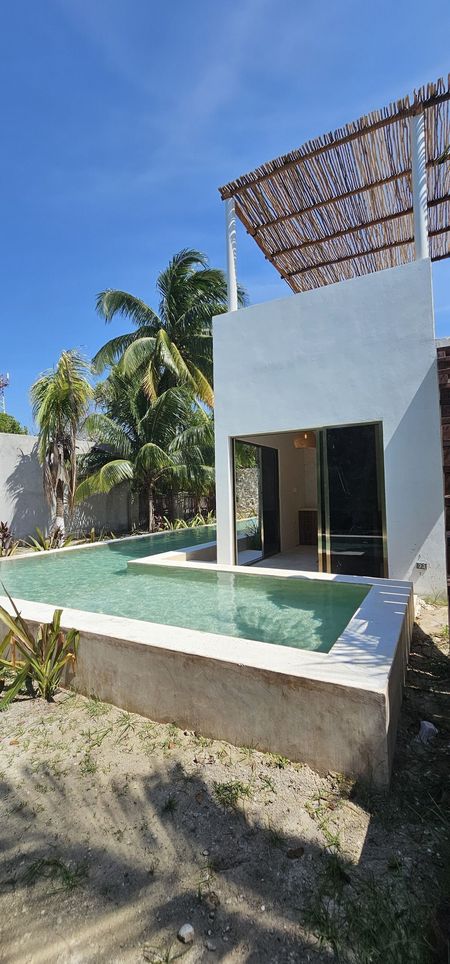 posibilidad de cambiar la entrada de la misma para que sea externa y sea completamente independiente del resto de la casa, la segunda recamara cuenta con baño propio y acceso directo a la alberca, la tercera recamara comparte un baño con las visitas y cuenta también con acceso directo a la alberca. La casa cuenta con una amplia Cocina-comedor equipada con vista a la alberca y al patio. Desde la cocina se puede apreciar un bello cuerpo de agua. La alberca en forma de L que rodea la propiedad y esta diseñado como un carril de nado y también un área de descanso tipo jacuzzi. En la parte de arriba de la cocina hay un rooftop techado con bajareque que funciona como una sala exterior.