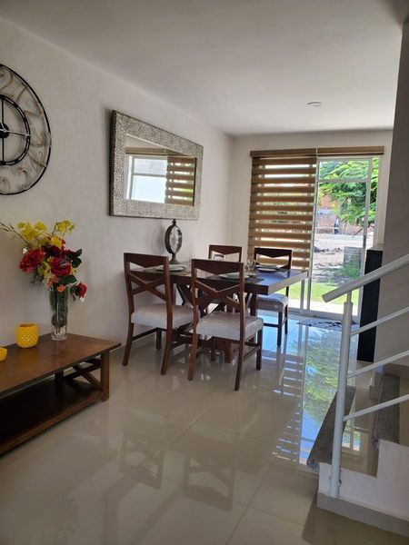Casa con bonitos acabados estilo minimalista, que por el diseño y distribución del clúster se aprecia una alberca semi olímpica con palapa de palma, servicio de baños y asador . acabado moderno cuenta con 2 acogedoras